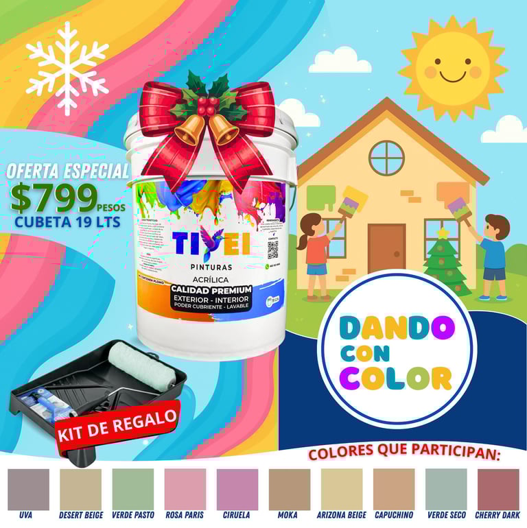 10 COLORES A ESCOGER POR 799 PESOS CUBETA DE 19 LITROS Y UN KIT DE ACCESORIOS GRATIS. DURANTE EL MES DE DICIEMBRE DESTINAREMOS UNA PARTE DE NUESTRA VENTA A LA RESTAURACION DE PINTURA DE UNA CASA HOGAR Y UN PARQUE LOCAL.