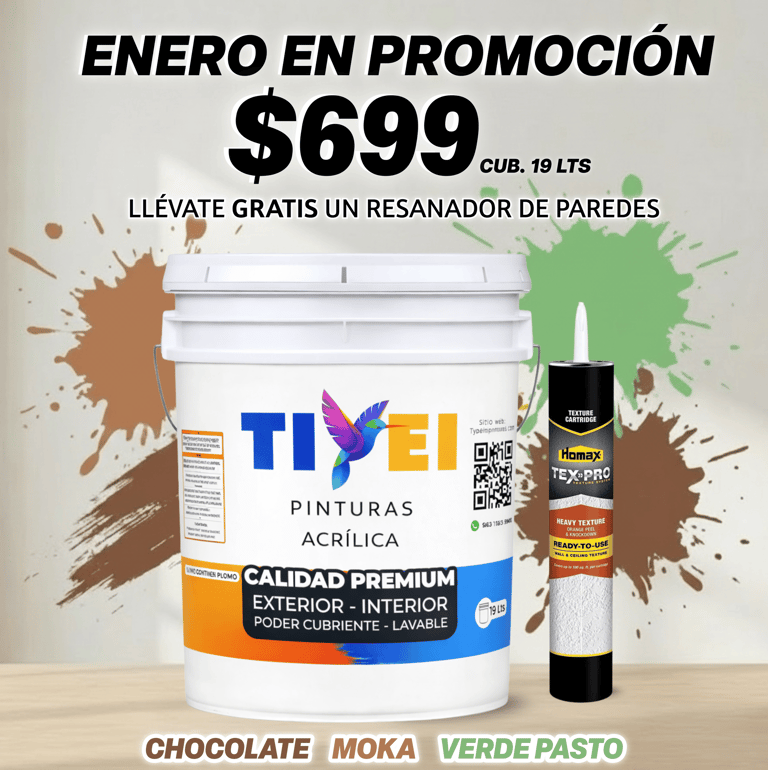 Cubeta de 19 Litros en color chocolate, moka y verde pasto a tan solo $699 pesos cada una y de regalo un resanador Tex-Pro para paredes.